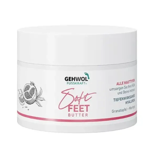BeschreibungGEHWOL FUSSKRAFT Soft Feet Butter pflegt und verwöhnt beanspruchte Füße und Beine intensiv mit hochwertigen Inhaltsstoffen und einem fruchtigen Duft. Die reichhaltige Formulierung mit Granatapfelextrakt und Moringaöl macht die Haut geschmeidig. Rückfettende Sheabutter verleiht der Haut ein angenehm weiches Hautgefühl und stärkt die Hautbarriere. Ein spezielles tiefenwirksames Hyaluron wird von der Haut aufgenommen und kann in Verbindung mit Vitamin E und Avocadoöl so die Hautregeneration unterstützen und die hauteigenen Abwehrkräfte stärken. Feuchtigkeit wird in tieferen Hautschichten gebunden und die Haut wird vor Hornhautbildung geschützt. Anwendung: Die Gehwol Soft Feet Butter auf der Haut verteilen und sanft einmassieren. Genießen Sie das Gefühl rundum gepflegter Füße. Das wohltuende GEHWOL FUSSKRAFT Soft Feet Pflegebad mit Mandelöl und das reinigende GEHWOL FUSSKRAFT Soft Feet Peeling mit Bambusgranulat bereiten die Haut optimal auf die nachfolgende Pflege vor. Die trockene Haut wird aufgeweicht, die Durchblutung angeregt und Hautschuppen werden abgelöst.Hauttyp